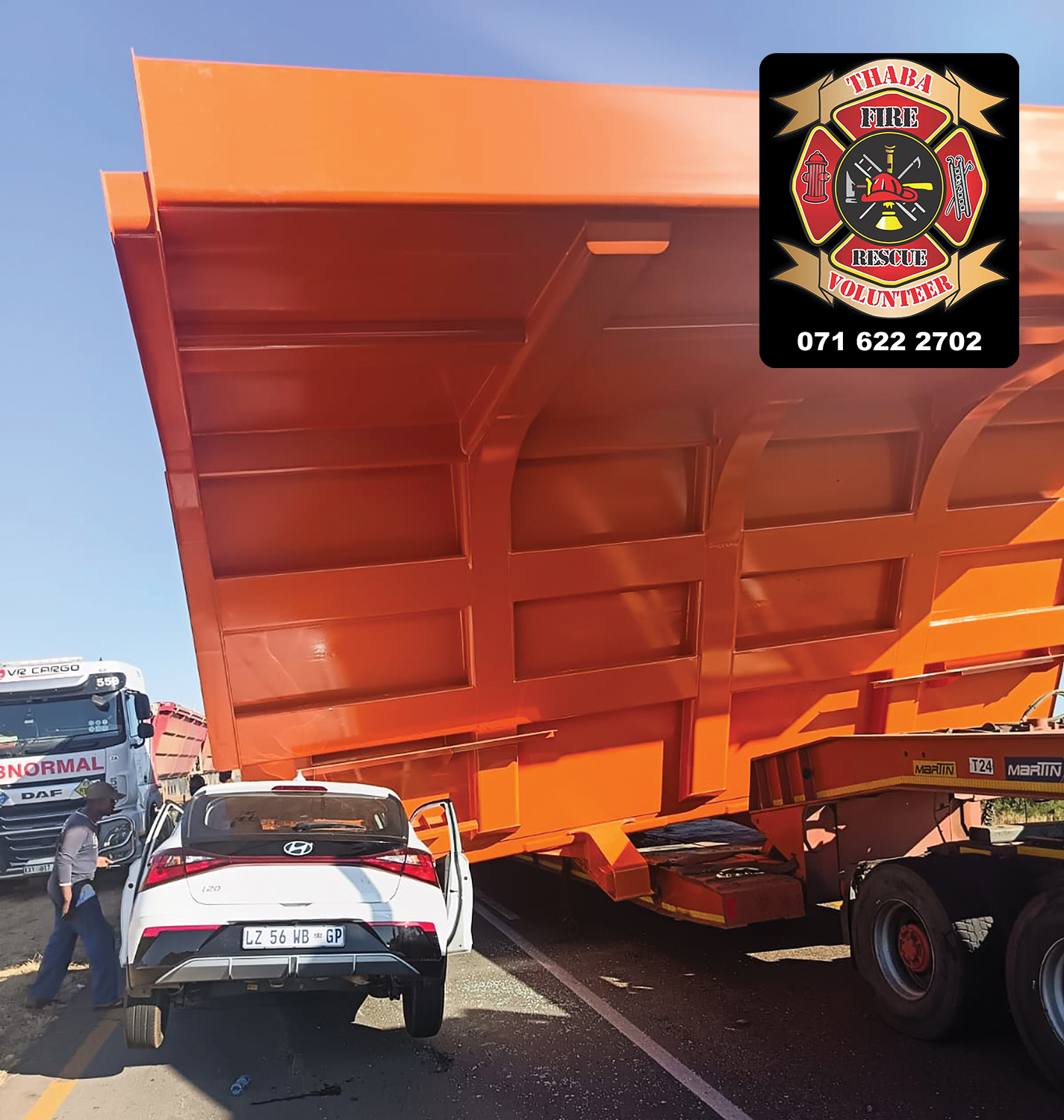 Thabazimbi – A serious collision between a white Hyundai i20 and an abnormal load brought traffic to a standstill on Thursday afternoon, 2 October 2025, along the R511 just after Cotton Gin on the Thabazimbi–Koedoeskop–Brits Road.