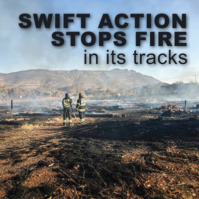 Thabazimbi – What started as a blaze on Warmbad Road, near Obaro and en route to Marakele National Park, quickly turned into one of the biggest fires the area has seen this season. Thanks to the rapid teamwork of local emergency services, the flames were contained before they could spread.